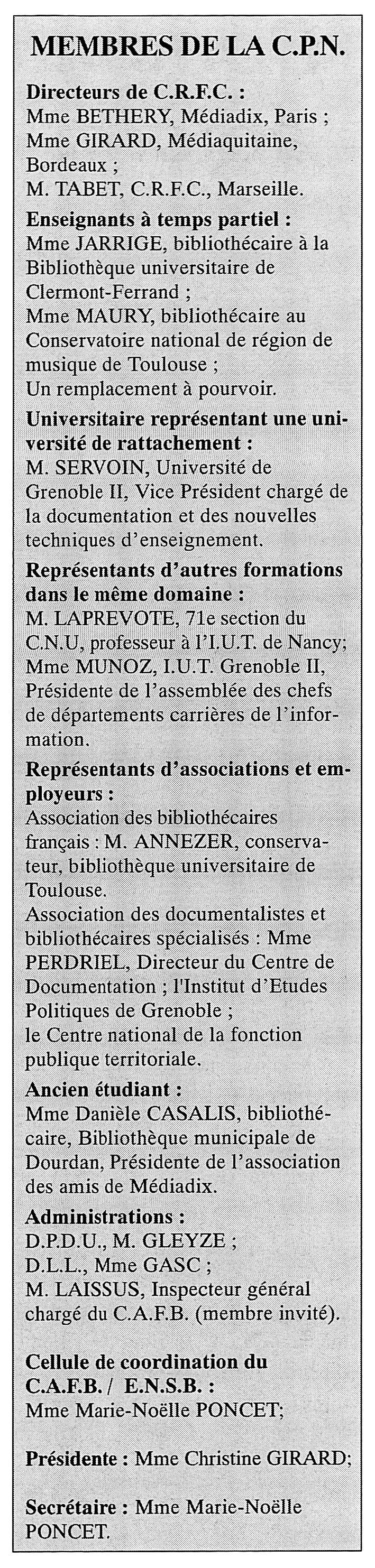 La C.P.N. fait régulièrement le point sur les autres formations : ENSSIB, préparation au CBA, enseignements universitaires, CAPES documentation..., et en examine les relations avec le C.A.F.B.