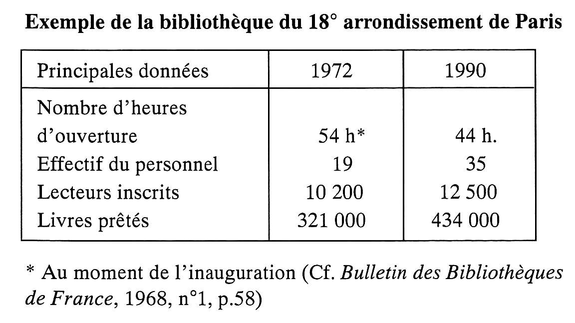 2) Les moyennes ci-dessus sont naturellement parcellaires. Elles ne concernent que les villes de plus de 10 000 habitants et que les centrales, alors que les chiffres concernant les villes moins importantes et les bibliothèques de quartier sont régulièrement envoyés par les municipalités au Ministère de la culture. Pour les quartiers notamment, l'annexe 2 au rapport annuel comporte une mine de renseignements dont on ne peut que regretter la non-exploitation.