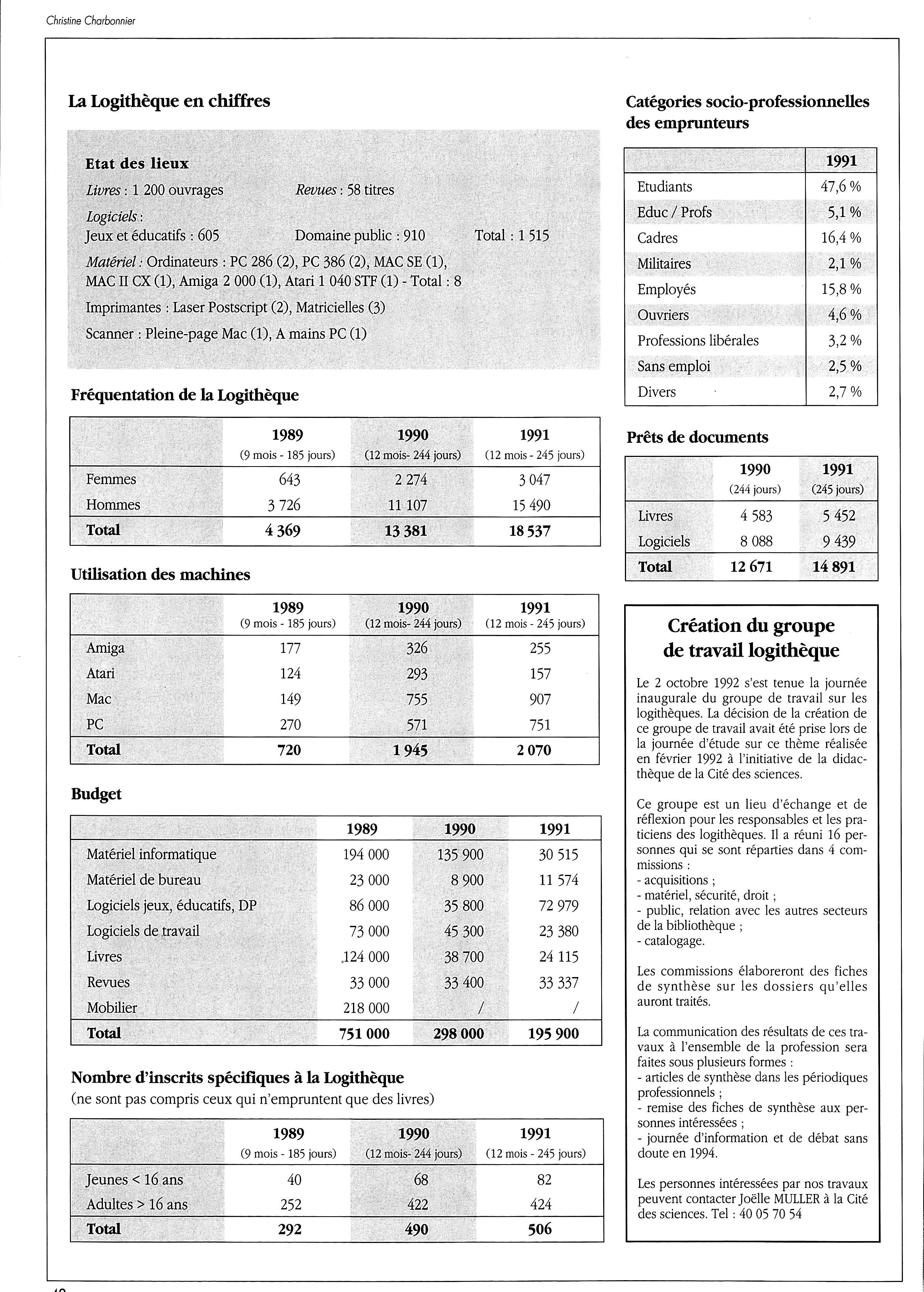 D'autre part, l'expansion des consoles de jeux nous amène aussi à réfléchir. Nous prêtons des logiciels de jeux car nous pensons que c'est une bonne manière d'attirer le public jeune et de pouvoir ainsi lui montrer que l'on peut faire autre chose avec un ordinateur que simplement jouer. Les logiciels de jeux vont-ils disparaître au profit des cartouches de consoles (plus de problèmes de piratage, de destruction) ? Et faudra-t-il alors prêter des cartouches de consoles ? On arrive là, à la limite entre la Logithèque et la Ludothèque...
