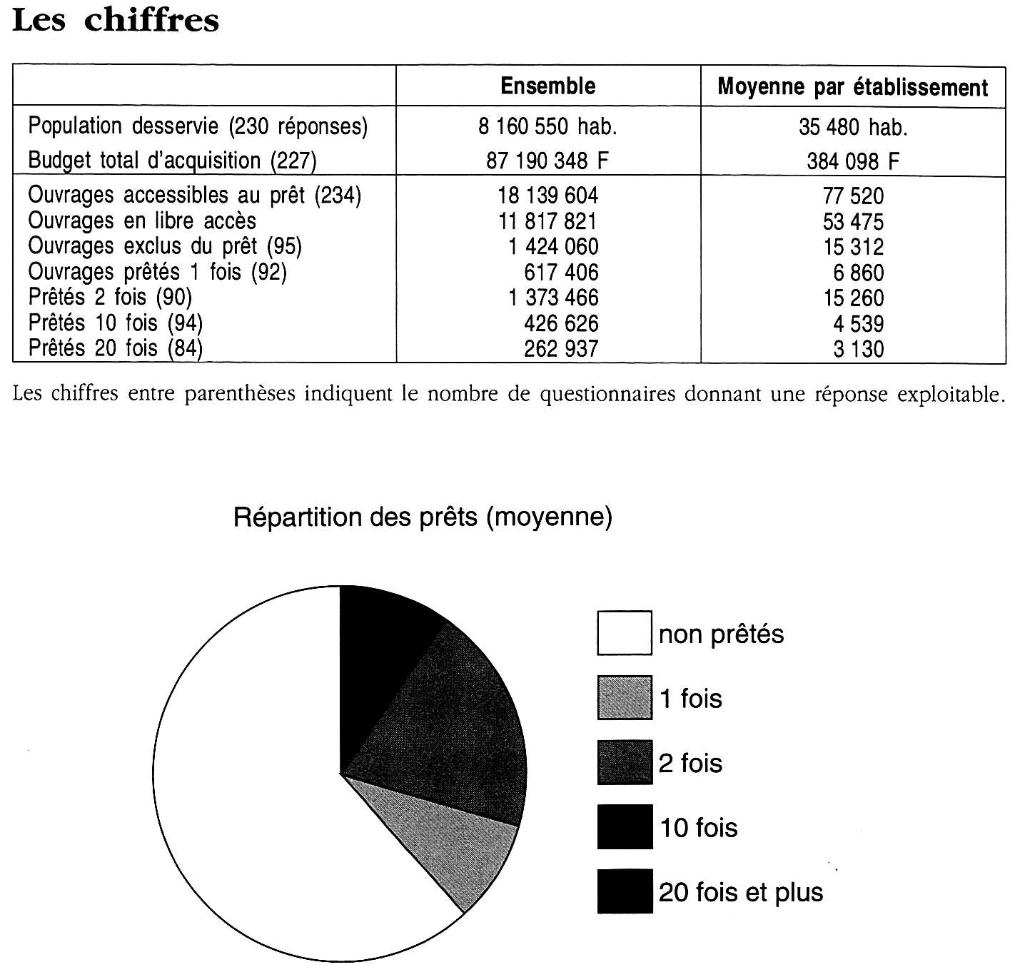 Les réponses n'ont malheureusement pas toutes atteint une qualité minimale pour une utilisation statistique. Si les chiffres de réponses utilisées vont de 234 pour les plus simples (population desservie, budget, nombre de docu- ments), pour les plus complètes (docu- ments non sortis sur un exercice, prêté 1 fois, 2 fois) il ne reste que 94 ques- tionnaires utilisables, soit seulement 37,45 %.
