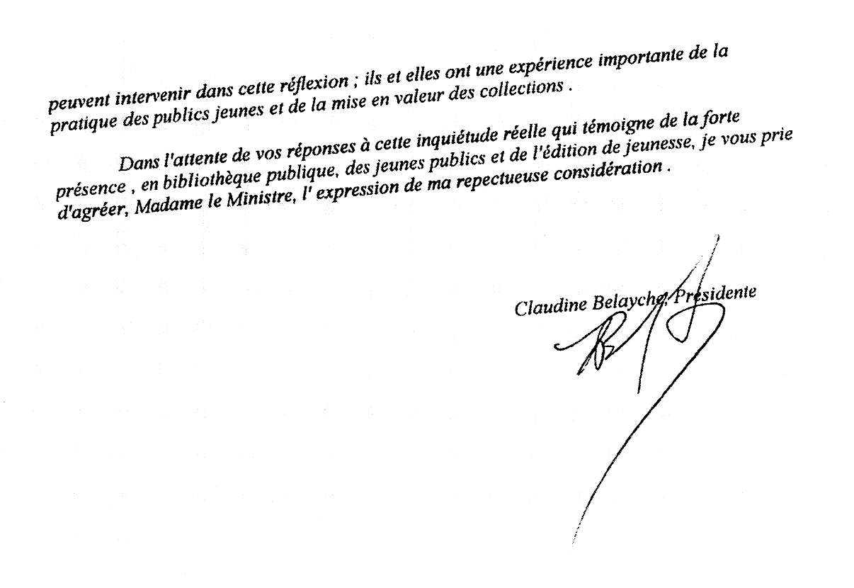 Alertée par nos collègues de La Joie par le livres, et par les informations diffusées dan la presse sur les difficultés de la BibliothèqL enfantine de Clamart et sur des mesun concernant le rattachement de La Joie p les livres à la Bibliothèque nationale France, l'association a décidé d'écrire madame Catherine Trautmann, ministre d< Culture et de la Communication, pour lui f; part des inquiétudes légitimes de nos ( lègues et de nos demandes concernant le fi des missions accomplies par La Joie pa livres dans le domaine de la littératur jeunesse.