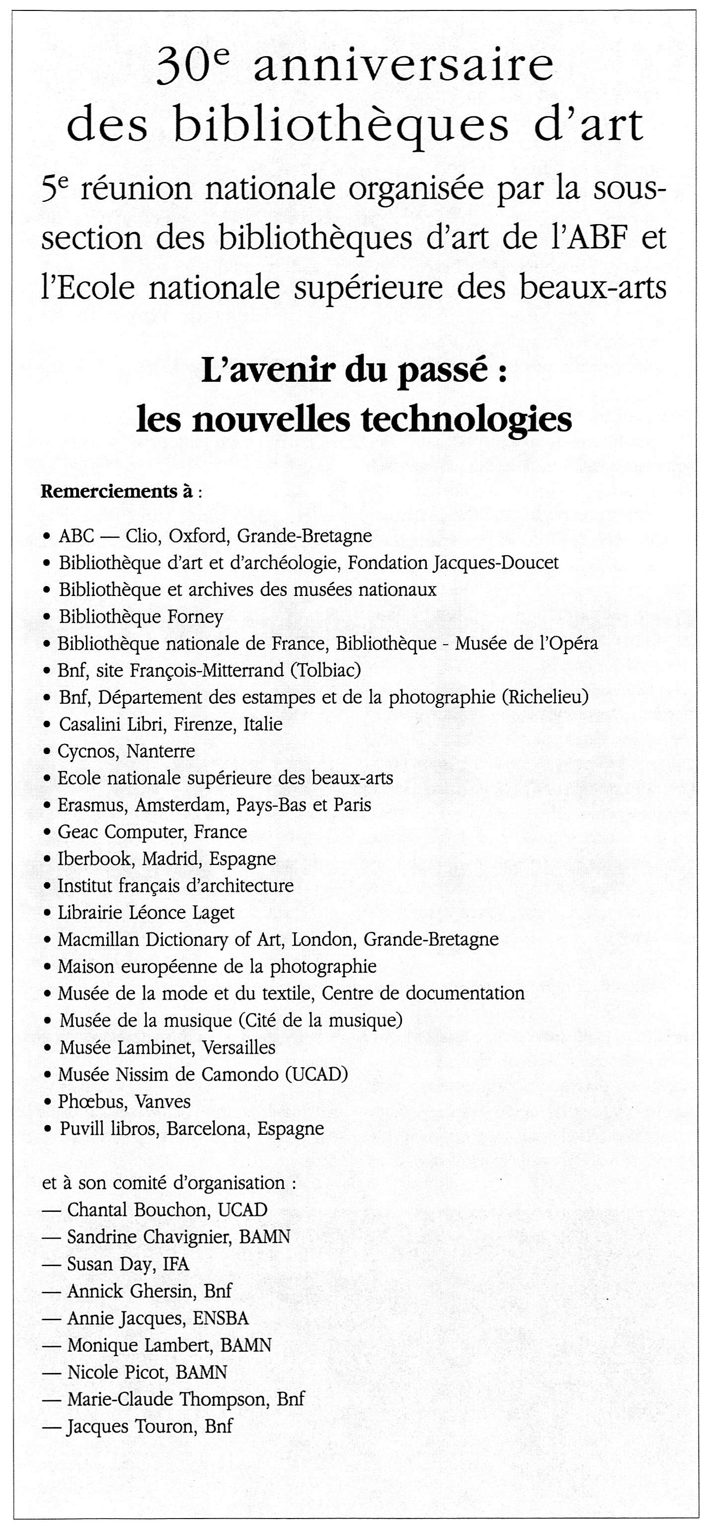 L'étude préparatoire a porté sur les différents catalogues bibliographiques informatisés, les catalogues d'objets, les inventaires, la qualité du service au lecteur, l'interface machine/utilisateur, l'accès aux catalogues de musées, aux bases de données multimédia, aux bases bibliographiques.