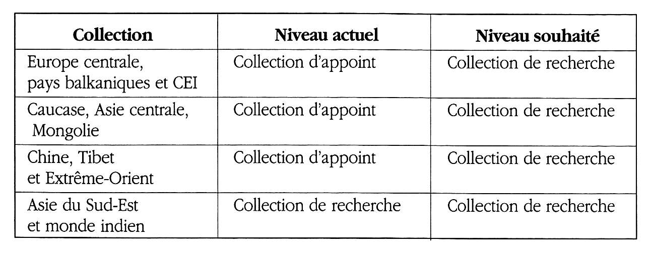 (2) Les programmes de recherche de divers laboratoires d'ethnologie et de préhistoire sont régulièrement collectés par les acquéreurs ; ils les guident dans le choix des titres courants. C'est en vue de satisfaire les besoins des chercheurs que la bibliothèque cherche à acquérir des publications spécialisées et de petit tirage, ainsi que de la littérature grise relevant des domaines de l'ethnologie et de la préhistoire.