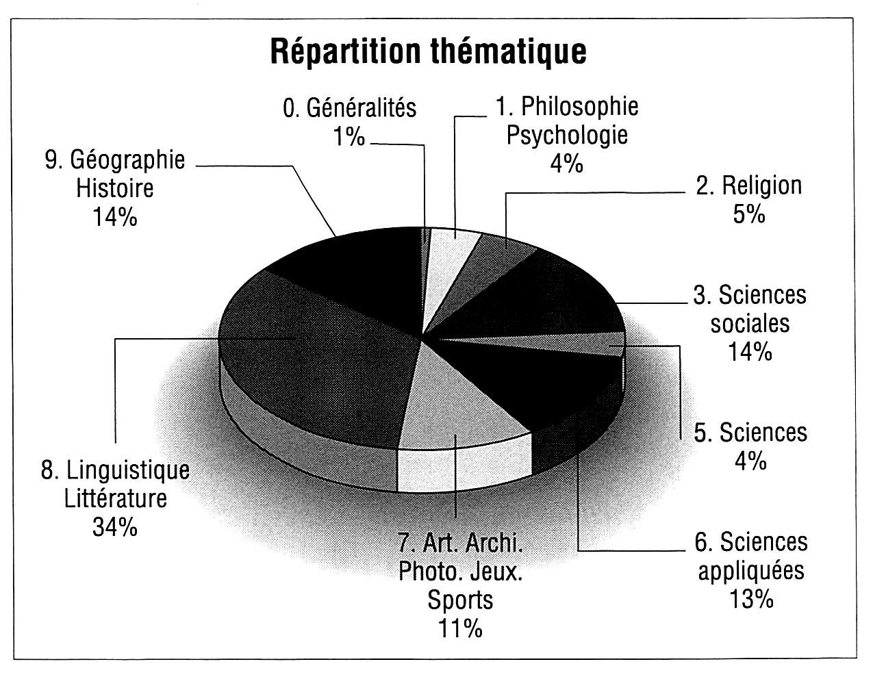 La répartition par grands domaines de la Classification décimale universelle des titres de livres publiés en 1999 montre la prépondérance de la littérature et la part respective des différentes disciplines (voir schéma ci-dessus).
