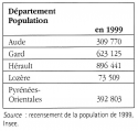 Les départements sont inégaux en termes de population (cf. encadré) et de configurations, avec des zones urbaines très concentrées autour des huit villes les plus importantes : quatre de 40 000 à 50 000 habitants (Narbonne, Carcassonne, Alès et Sète), une autour de 70 000 (Béziers), deux de 100 000 (Perpignan et Nîmes) et une métropole en expansion permanente avec plus de 200 000 habitants (Montpellier).