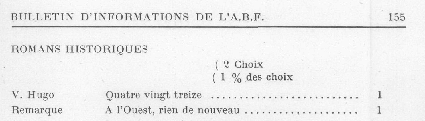 Donc les ouvrages d'évasion dans le passé (romans historiques), (récits de marine à voile (FORESTER) - (de cape et d'épée, etc.) ou dans le futur (anticipation) qui sont tout de même très lus (surtout pour cette dernière catégorie : anticipation) ne sont pas retenus en définitive comme ayant été les plus appréciés.- Ce qui est apprécié c'est ce qui se passe à l'heure présente ou - sur le plan historique - les ouvrages romancés se rapportant à la dernière guerre (Bal des maudits - Berlin-hôtel).