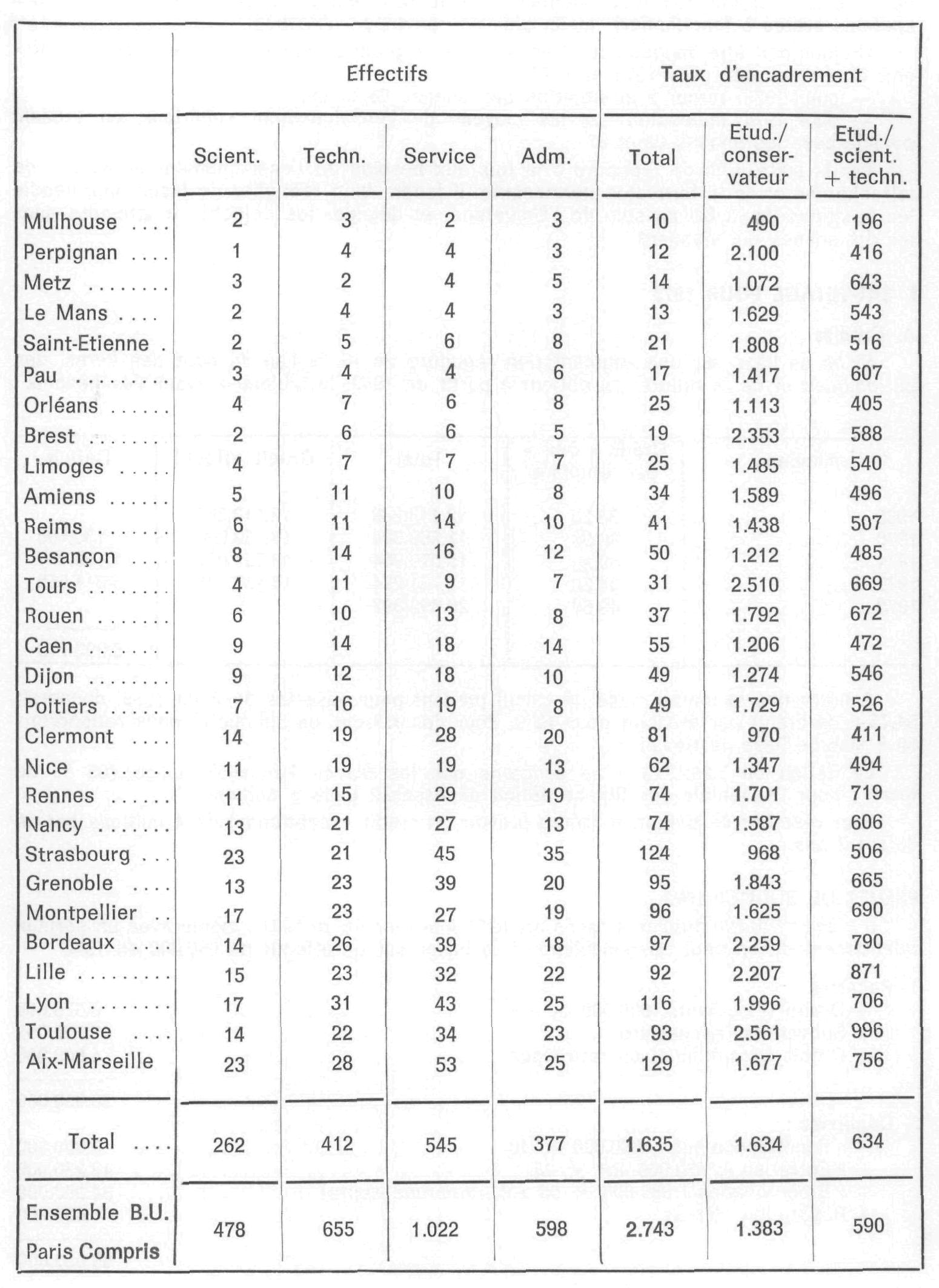 Ce tableau est à rapprocher des effectifs étudiants et des surfaces (tableau 2). Il faut évidemment aussi tenir compte d'éléments qui échappent aux moyennes (encadrement minimum pour les petites bibliothèques, encadrement plus fort en personnels scientifiques pour Strasbourg comme pour Paris, nombre de sections de bibliothèques par B.U.].