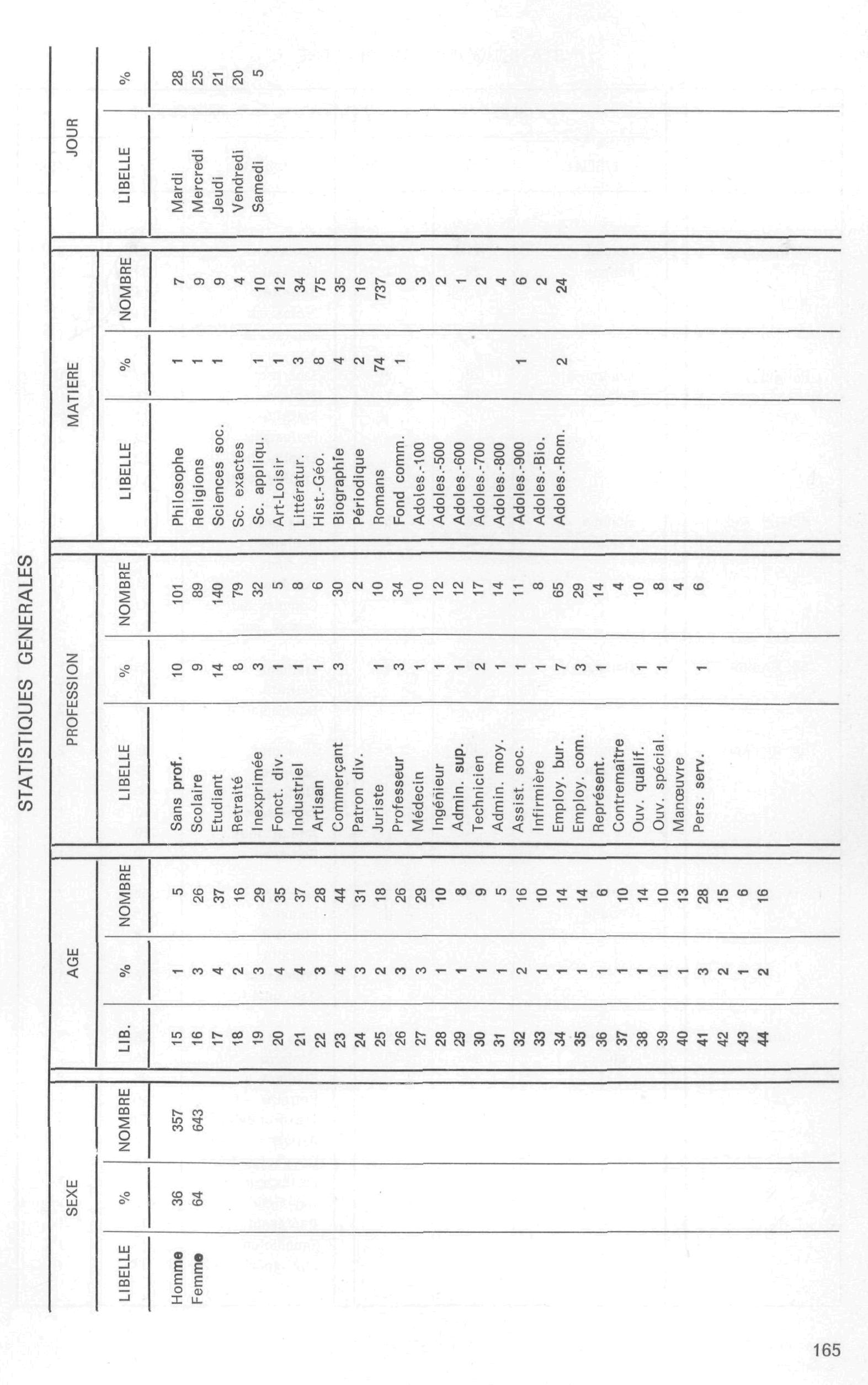 Nous n'insisterons pas sur l'élaboration technique de celles-ci. Nous dirons simplement qu'elles ont été faites sous forme de tableaux avec 5 variables discriminatoires, (le sexe, l'âge, la profession du lecteur ; la cote de l'ouvrage emprunté, et le jour de son emprunt). (Voir pages suivantes).