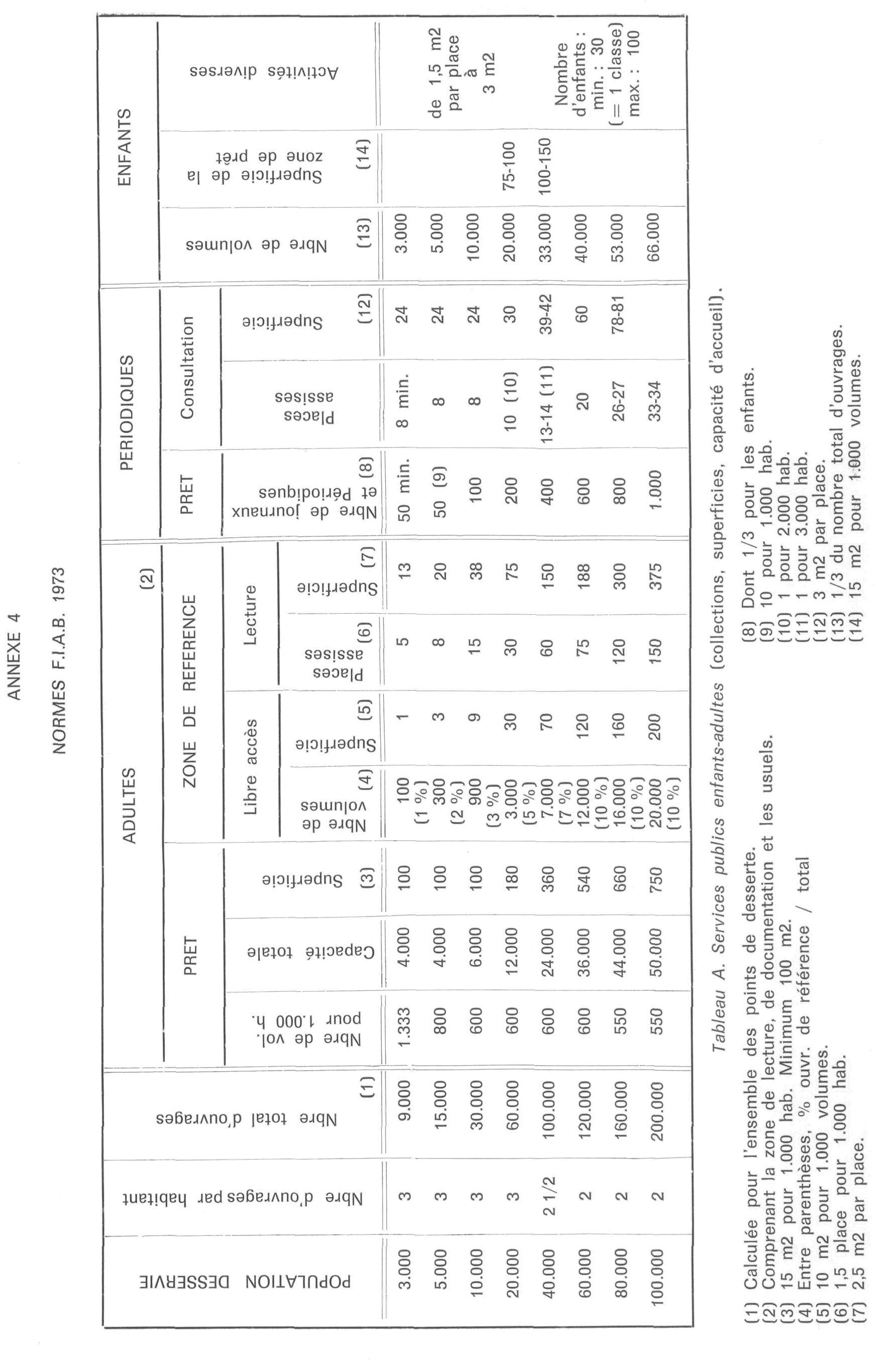 - Standards for Public libraries (n° 15) publié par la F.I.A.B. en 1973. Normes internationales établies par des bibliothécaires travaillant dans des pays où les bibliothèques sont très développées (Cf. Annexe 4).